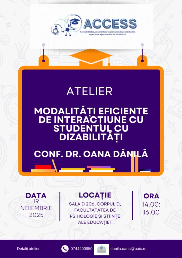 Avem plăcerea de a vă invita să participați la atelierul de formare intitulat „Modalități eficiente de interacțiune cu studentul cu dizabilități”, organizat în cadrul proiectului ACCESS- CNFIS-FDI-2025-F-0449.
